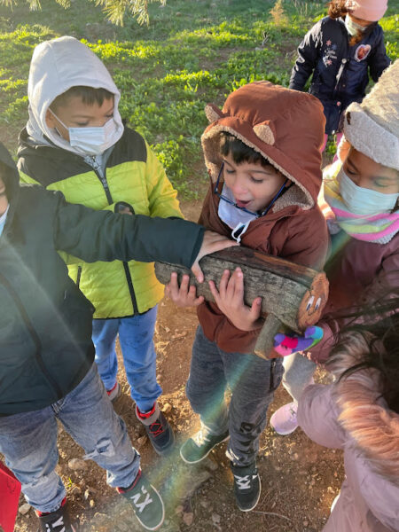 Aquests dies, el Tió està apareixent a les diferents comunitats del centre. A primer, ahir els nens i nenes vam arribar a la classe i ens vam trobar una carta. Era del Tió!!! Necessitava la nostra ajuda: s’havia perdut per la muntanya pelada i no sabia arribar a la nostra escola. Així que, ens vam abrigar molt i vam anar a buscar-lo. Després d’unes quantes pistes, el vam trobar sota un arbre!!!